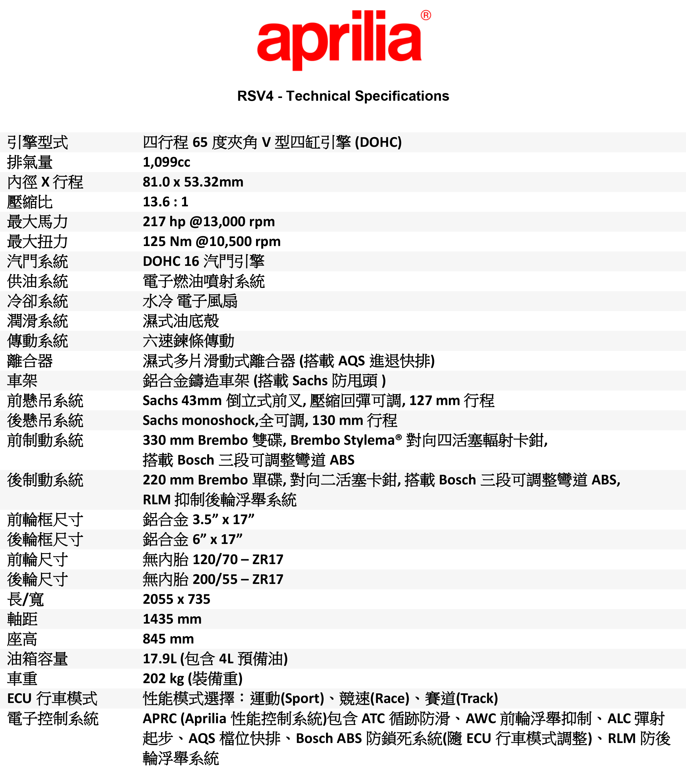 Aprilia賽車部門集大成之作,採用了最好的電子輔助技術、提升的空氣動力學效率、217馬力和比以往更大的扭力,所有這些都嚴絲合縫地結合在RSV4上。