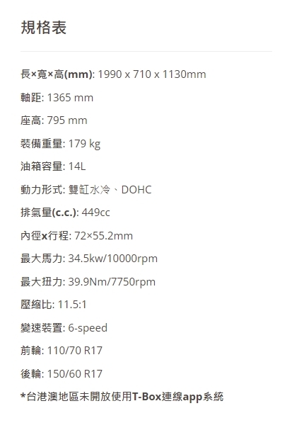 擁有450cc並列雙缸引擎,最大功率達37kw @ 9500rpm。