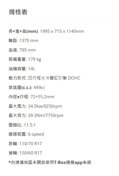 動力形式: 四行程水冷雙缸引擎 DOHC