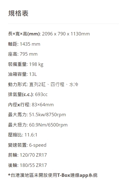 配備了ABS、電子油門、滑動式離合器、定速巡航、Brembo煞車、KYB懸吊、和LED照明等預設標準配置。