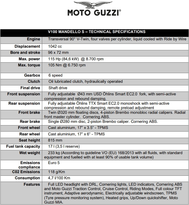 借鑒Moto Guzzi在這一世紀以來在二輪界的經驗與創新,V100 Mandello S 是一款將典型的跑車和旅行車特性合而為一,並推向極緻的版本。